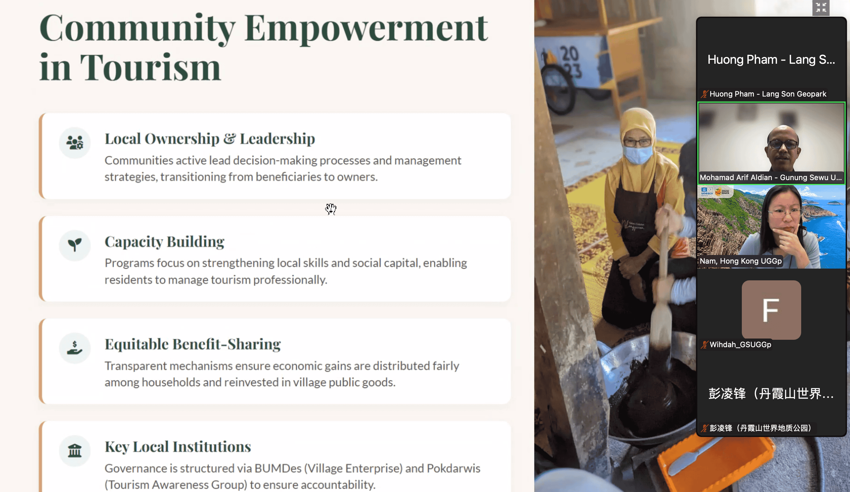 Ngày 27 tháng 02 năm 2026. Trung tâm Xúc tiến Đầu tư, Thương mại và Du lịch tham gia họp trực tuyến với Mạng lưới Công viên địa chất Châu Á - Thái Bình Dương. Trong chương trình, Ông Arif Aldian trình bày bài tham luận với chủ đề: “Vai trò của cộng đồng trong phát triển du lịch bền vững – Mô hình Làng Nglanggeran”. Bài tham luận tập trung phân tích vai trò của cộng đồng địa phương trong phát triển du lịch bền vững, cơ chế tổ chức, quản lý dựa vào cộng đồng; phương thức phân chia lợi ích công bằng; đồng thời nhấn mạnh việc gắn phát triển du lịch với bảo tồn các giá trị địa chất, tự nhiên, văn hóa và nâng cao sinh kế cho người dân.