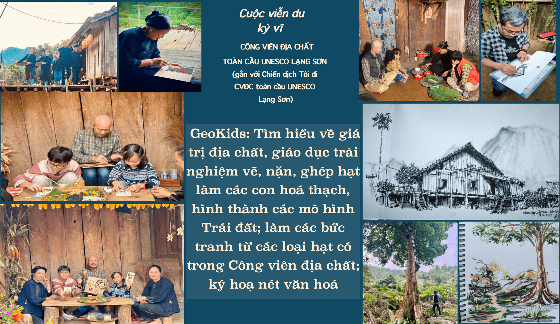 h) Không gian GeoKids: Tìm hiểu về giá trị địa chất, giáo dục trải nghiệm vẽ, nặn, ghép hạt làm các con hoá thạch, hình thành các mô hình Trái đất; làm các bức tranh từ các loại hạt có trong CVĐC; ký hoạ nét văn hoá