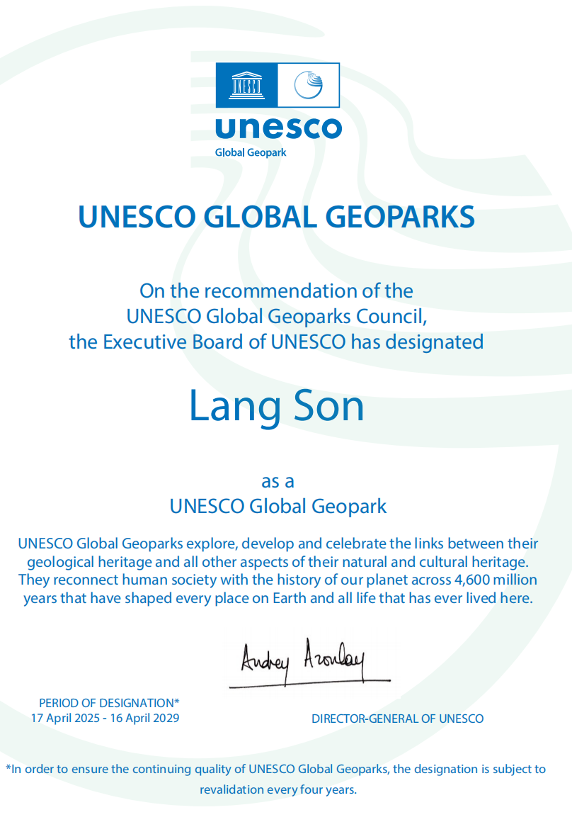 Ngày 02/4/2026 Uỷ ban nhân dân tỉnh Lạng Sơn ban hành Quyết định số 614/QĐ-UBND kèm theo Quy chế Quản lý và bảo vệ môi trường Công viên địa chất toàn cầu UNESCO Lạng Sơn. Quy chế xác lập cơ sở pháp lý để bảo tồn, phát huy giá trị di sản địa chất, văn hoá và đa dạng sinh học độc đáo trong Công viên địa chất toàn cầu UNESCO Lạng Sơn. Quy chế góp phần quản lý, ngăn chặn các hành vi xâm hại di sản, môi trường, cảnh quan thiên nhiên, đa dạng sinh học, thúc đẩy phát triển bền vững và nâng cao nhận thức cộng đồng, đáp ứng tiêu chí của UNESCO, bảo vệ thương hiệu Công viên địa chất toàn cầu lâu dài.